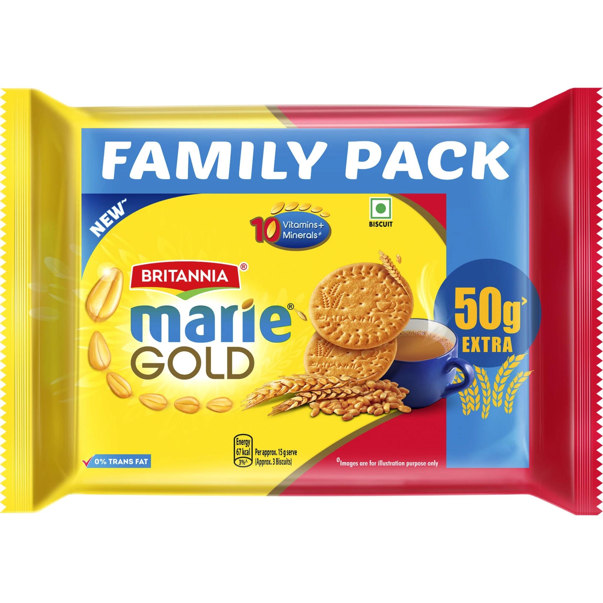 Britannia Marie Gold Biscuits are one of the most popular tea-time biscuits in India, known for their light texture, crisp bite and mild sweetness. Made with refined wheat flour (maida), sugar, palm oil and milk solids, these biscuits are carefully baked to golden perfection to deliver a delightful crunch in every bite.
