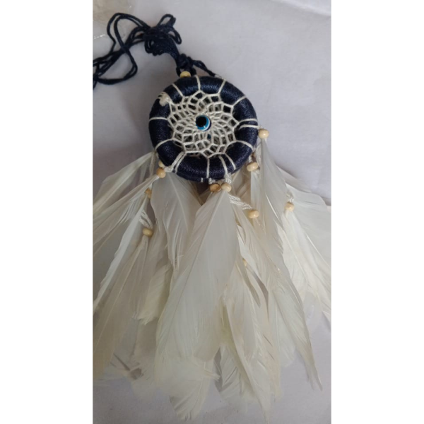 Add a touch of calm elegance to your space with this handmade Dark Blue Dream Catcher, beautifully crafted with intricate weaving, soft white feathers, and natural wooden beads for a peaceful and st