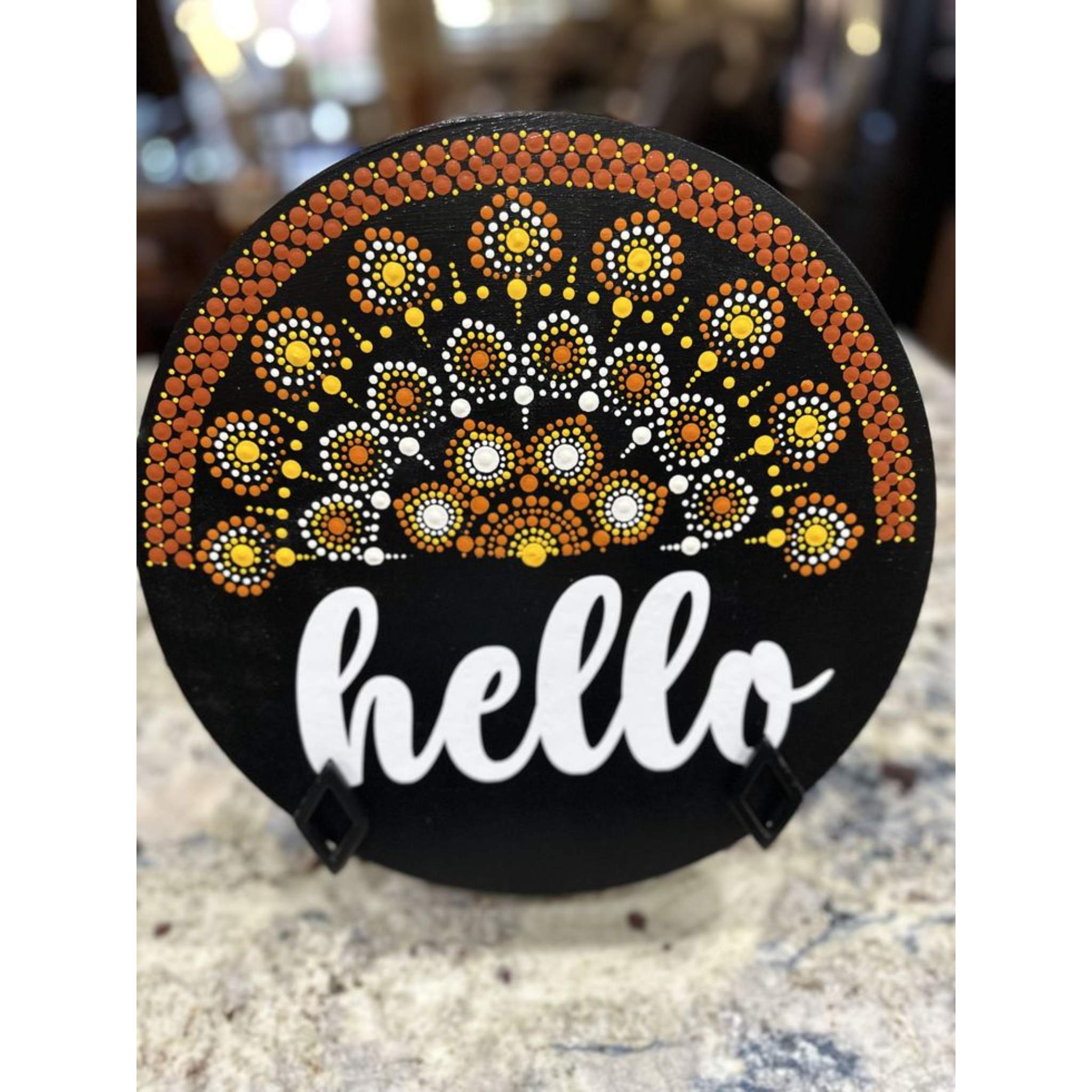 Bring warmth and elegance to your home with this Handcrafted Dotted Mandala Art Hello Board by Angel Hoop Arts.