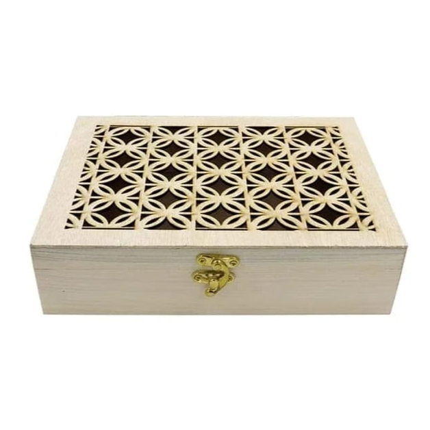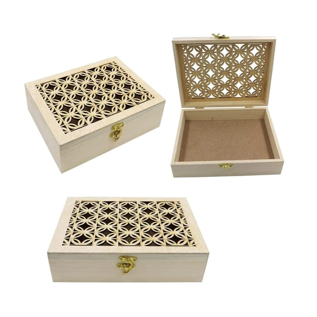 This beautifully crafted Wooden Decorative Storage Box features an elegant floral lattice cut lid with a smooth natural wood finish. Perfect for storing jewelry, pooja items, chocolates, gifting essentials, coins, and keepsakes.