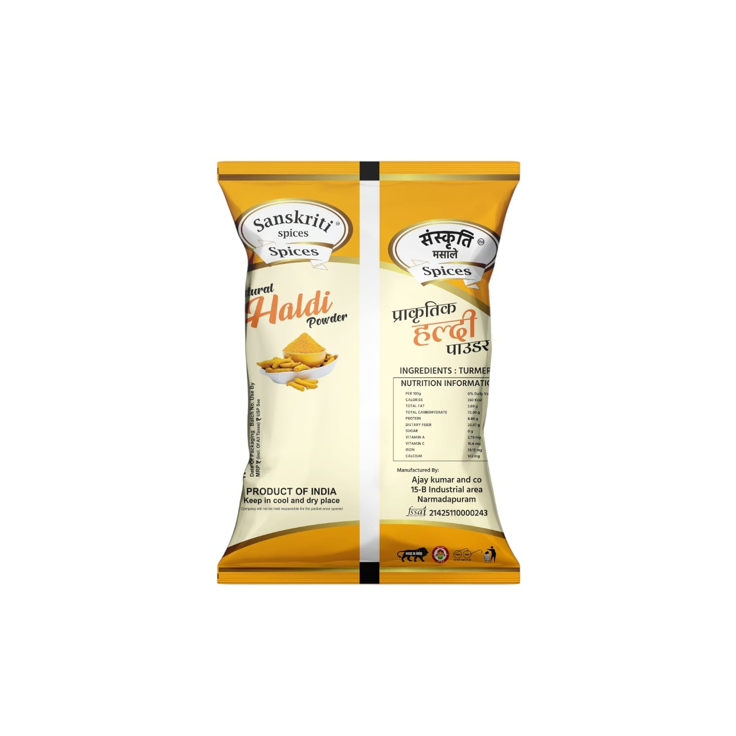 Sanskriti Masale Natural Haldi Powder is made from premium quality turmeric roots, finely ground to retain its natural colour, aroma and medicinal benefits. Perfect for daily cooking, health, beauty and Ayurveda use.