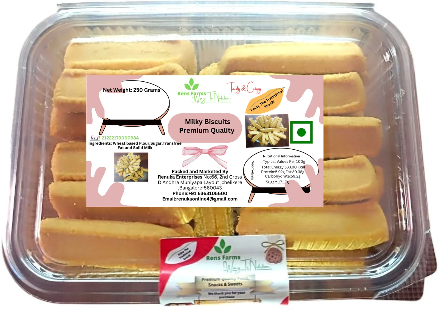 Rens Farms Baked Delight Premium Milk Cookies are crafted using carefully selected ingredients and traditional baking methods to provide a delightful snacking experience. These cookies are hand-rolled and baked to perfection, giving them a rich buttery flavor and crispy texture.