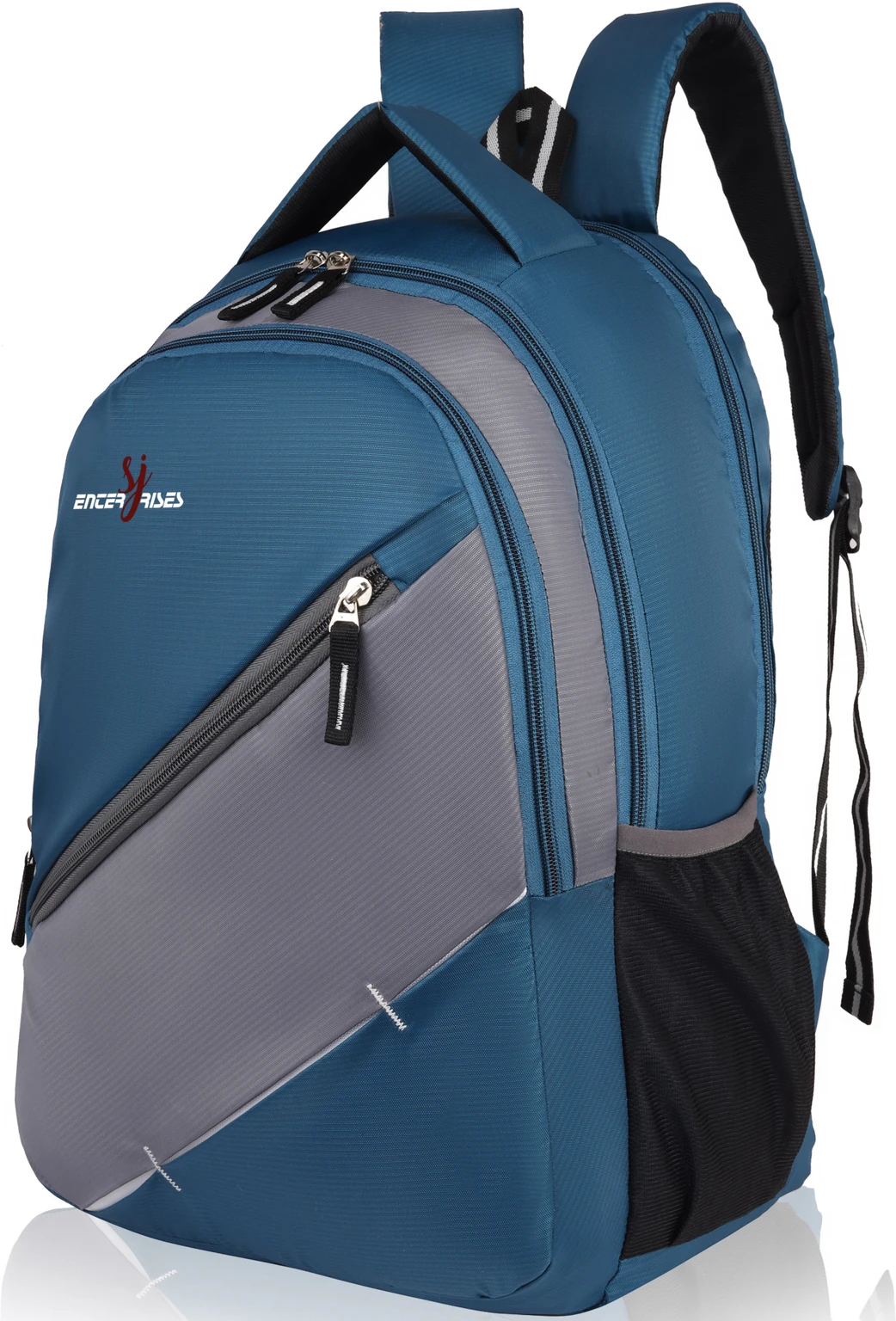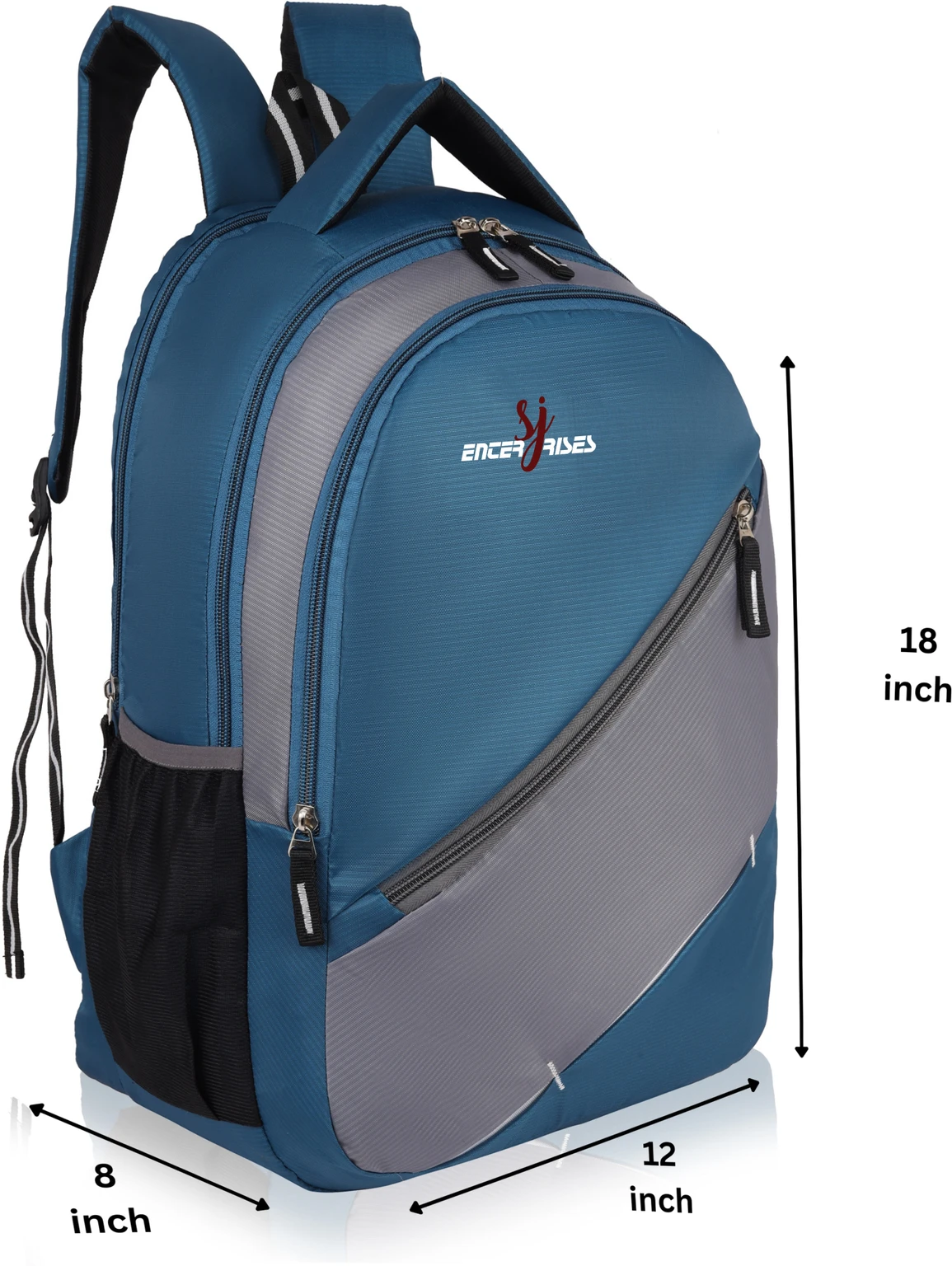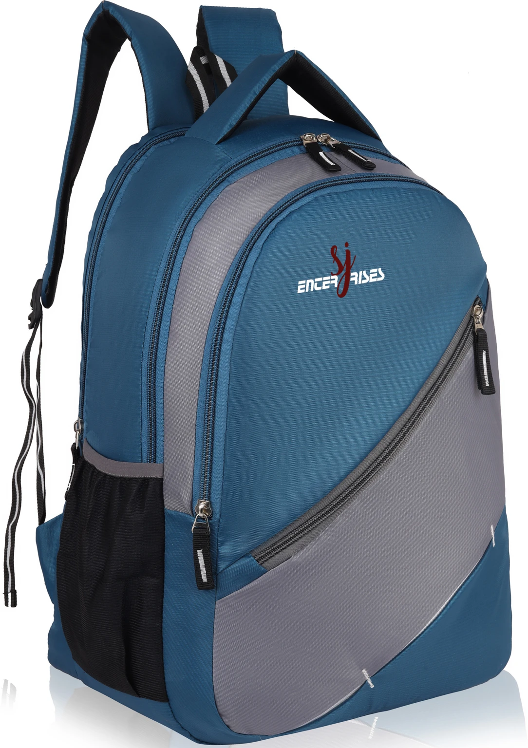 SJ Enterprises Stylish Laptop Backpack is designed to provide both style and functionality for students, professionals, and travelers. Made from durable polyester material, this backpack offers excellent strength and resistance to daily wear and light water exposure. The bag features a large main compartment with a dedicated padded sleeve that can safely hold laptops up to around 15.6 inches. Multiple zipper pockets and compartments help keep books, notebooks, accessories, and gadgets well organized. A front diagonal zipper pocket provides quick access to frequently used items such as mobile phones, chargers, and stationery. The backpack has padded adjustable shoulder straps and a breathable back panel that reduce strain and provide comfortable carrying even for long hours. Two side mesh pockets allow you to carry water bottles or umbrellas easily.