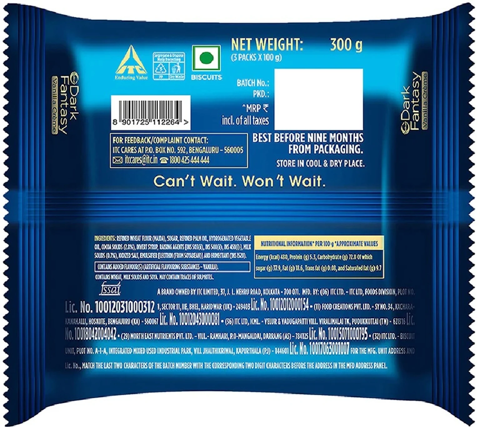 The 300 g family pack contains multiple smaller packs, making it convenient for sharing with friends and family or enjoying as a quick snack during tea breaks, travel, or leisure time. With its indulgent taste and crunchy-creamy texture, Sunfeast Dark Fantasy Vanilla Creme biscuits are ideal for satisfying sweet cravings anytime.