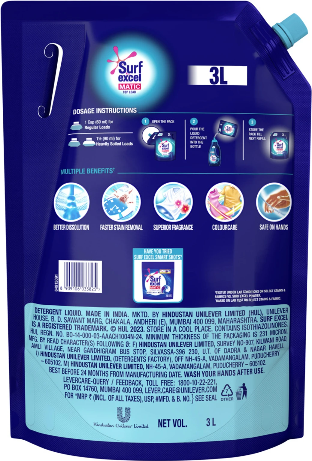 Surf Excel Matic Liquid Detergent – Top Load is specially formulated for use in top load washing machines. Its powerful cleaning formula penetrates deep into fabric fibers to remove tough and dried stains effectively.Unlike ordinary detergents, this liquid detergent produces the right amount of foam for washing machines, ensuring better cleaning and easy rinsing without residue. It helps maintain fabric softness and color brightness after every wash.The fast-dissolving liquid formula prevents powder residue on clothes and in the machine drum. Suitable for all types of washable fabrics including cotton, synthetics, and blends, it ensures a fresh and hygienic wash every time.